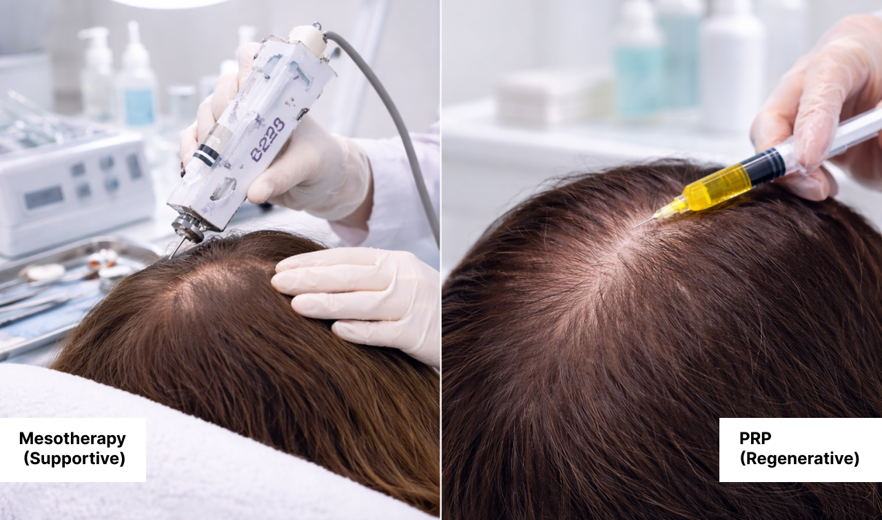 They do not. Mesotherapy focuses on nutrient delivery and scalp support, while PRP focuses on biological stimulation at the follicular level.